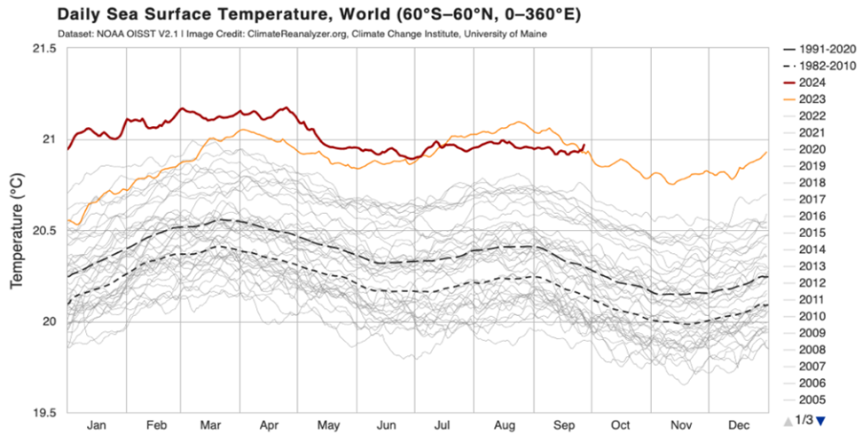 Cette illustration, tirée de l’Institut du changement climatique de l’Université du Maine,montre bien que la température des océans dans le monde, pendant les années 2023 et 2024, ont significativement augmenté de manière soudaine. Cela a des répercussions sur la vie marine et le climat. Encore une fois, on ne sait pas réellement expliquer les causes de ce soudain réchauffement des océans.