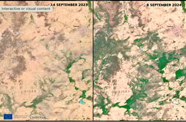 Observez ici l’évolution de la végétation de cette partie du Sahara en l’espace d’un an. De telles anomalies statistiques posent question.Pour l’instant, la communauté scientifique ne s’est pas encore accordée sur ce qui a pu causer cela. Cependant il ne fait nul doute que le réchauffement climatique, qu’il soit ici une cause ou une conséquence, y est impliqué.