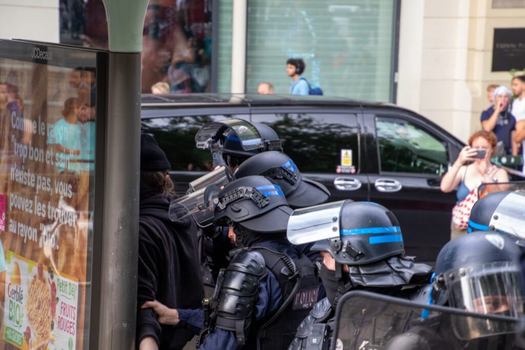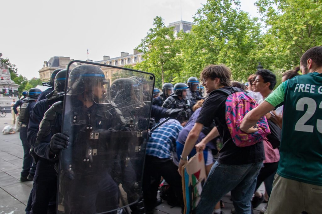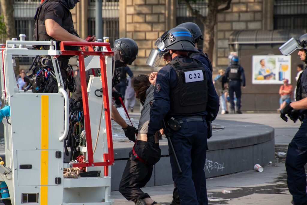 Vers 19 heures, alors que des manifestants tentent de revenir vers la statue pour soutenir les camarades encerclés, la situation dégénère. Des interpellations d’une violence extrême ont lieu. Des policiers escaladent la structure pour arracher les militants, les traînent sur plusieurs mètres de hauteur, risquant de les faire chuter. Un homme est matraqué en pleine tête alors qu’il passait simplement par là. D’autres sont roués de coups au sol, poursuivis jusque dans le métro, poussés dans les escaliers. On n’arrête plus la machine : charges sans sommation, gaz lacrymogènes à outrance, la BRAV-M et les CRS quadrillent la place comme un champ de bataille.