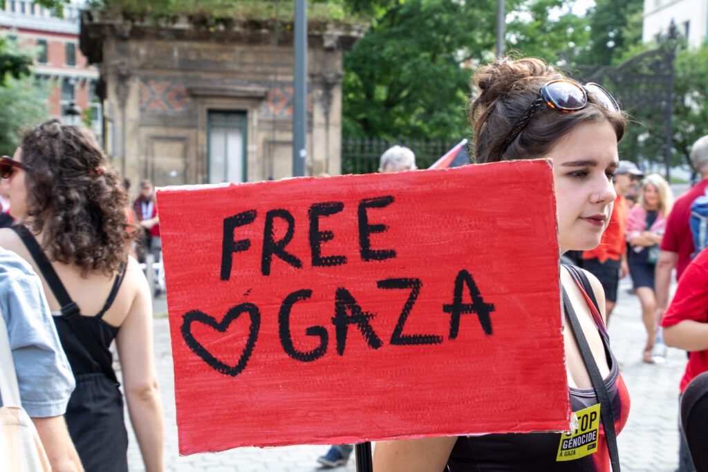 Un geste simple mais fort : marcher sur un long tissu rouge déployé au sol. Une ligne visible, morale et politique. Celle que les gouvernements européens refusent de tracer, préférant, comme l’a martelé une manifestante, « détourner le regard au nom de prétendus équilibres diplomatiques ».