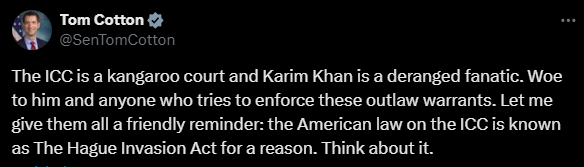 C’est dans un post sur le réseau social X que le sénateur menace l’Etat néerlandais et qu’il insulte la CPI ainsi que Karim Khan, procureur de celle-ci. « La CPI est un tribunal de kangourous et Karim Khan est un fanatique dérangé. Malheur à lui et à quiconque tenterait d’appliquer ces mandats illégaux », a écrit Cotton à ses abonnés sur X.
